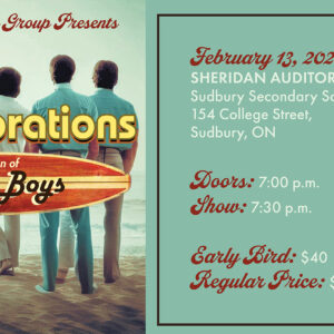 7:30-10 pm – Good Vibration (Beach Boys Tribute) 29 May 7:30 pm - 10:00 pm Sheridan Auditorium, Sudbury Secondary School 154 College St, Greater Sudbury