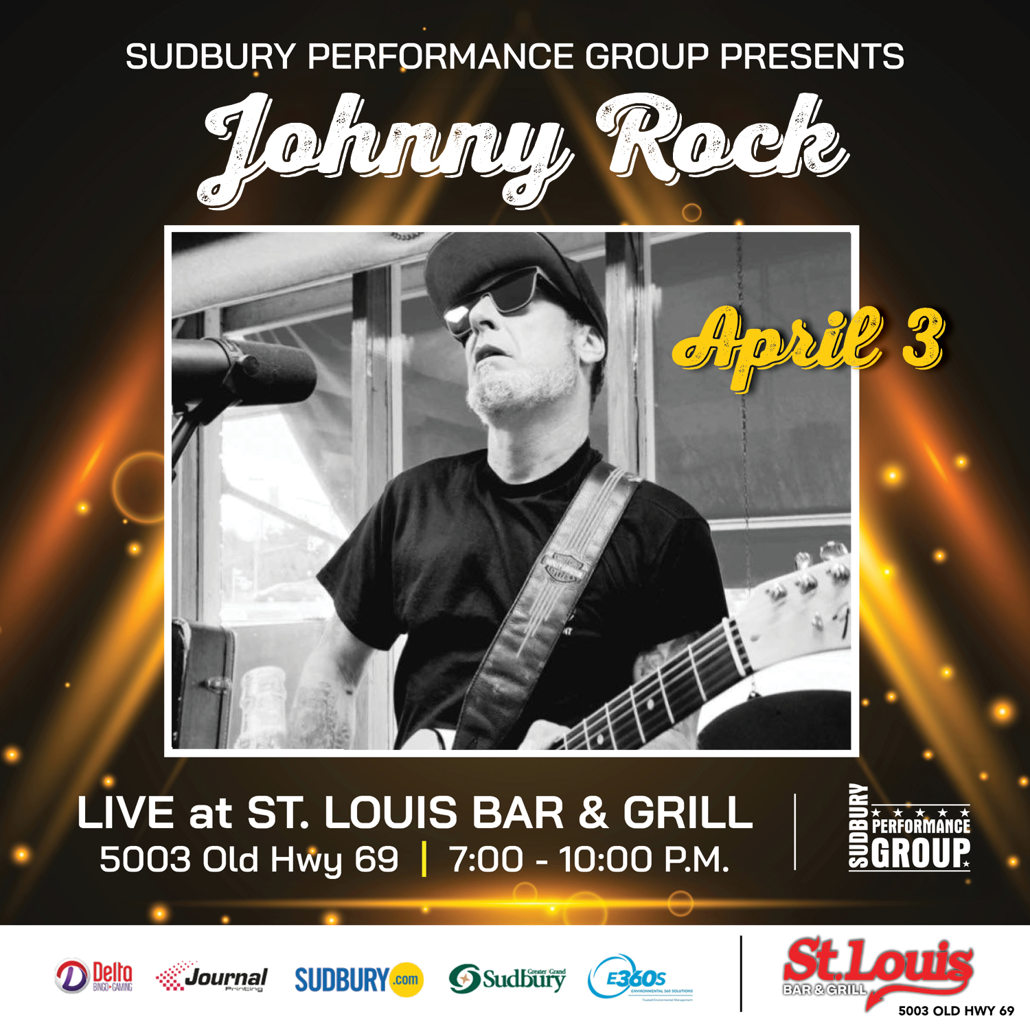 Home Events - Sudbury Performance Group Music Johnny Rock Location St. Louis Bar & Grill (Hanmer) 5003 Old Hwy 69, Greater Sudbury, ON P3P 1A9 Category Music Date Apr 03 2026 Expired! Time 7:00 pm - 10:00 pm Johnny Rock Share this event