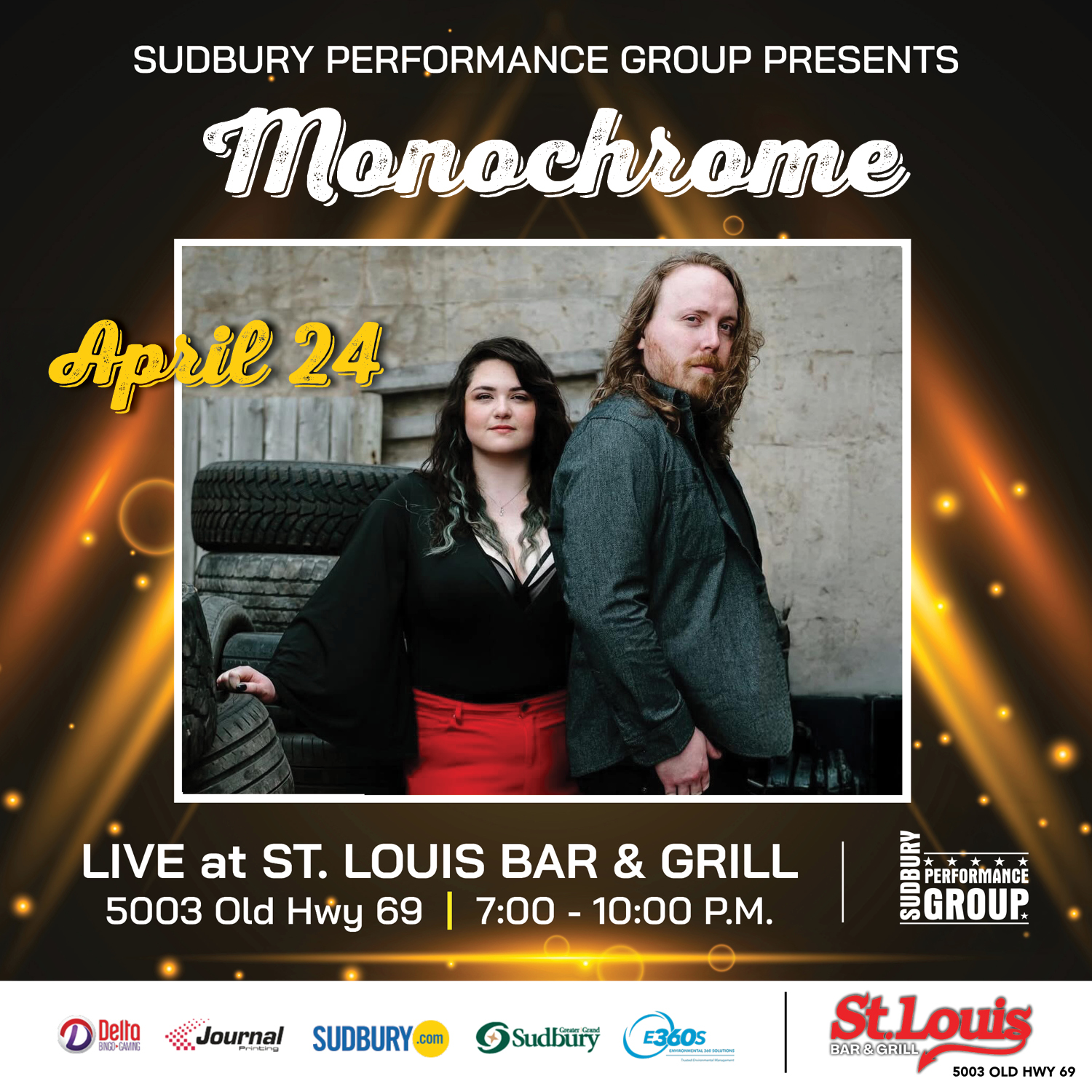 Home Events - Sudbury Performance Group Music Monochrome Location St. Louis Bar & Grill (Hanmer) 5003 Old Hwy 69, Greater Sudbury, ON P3P 1A9 Category Music Date Apr 24 2026 Time 7:00 pm - 10:00 pm Monochrome Share this event + Add to Google Calendar + iCal / Outlook export