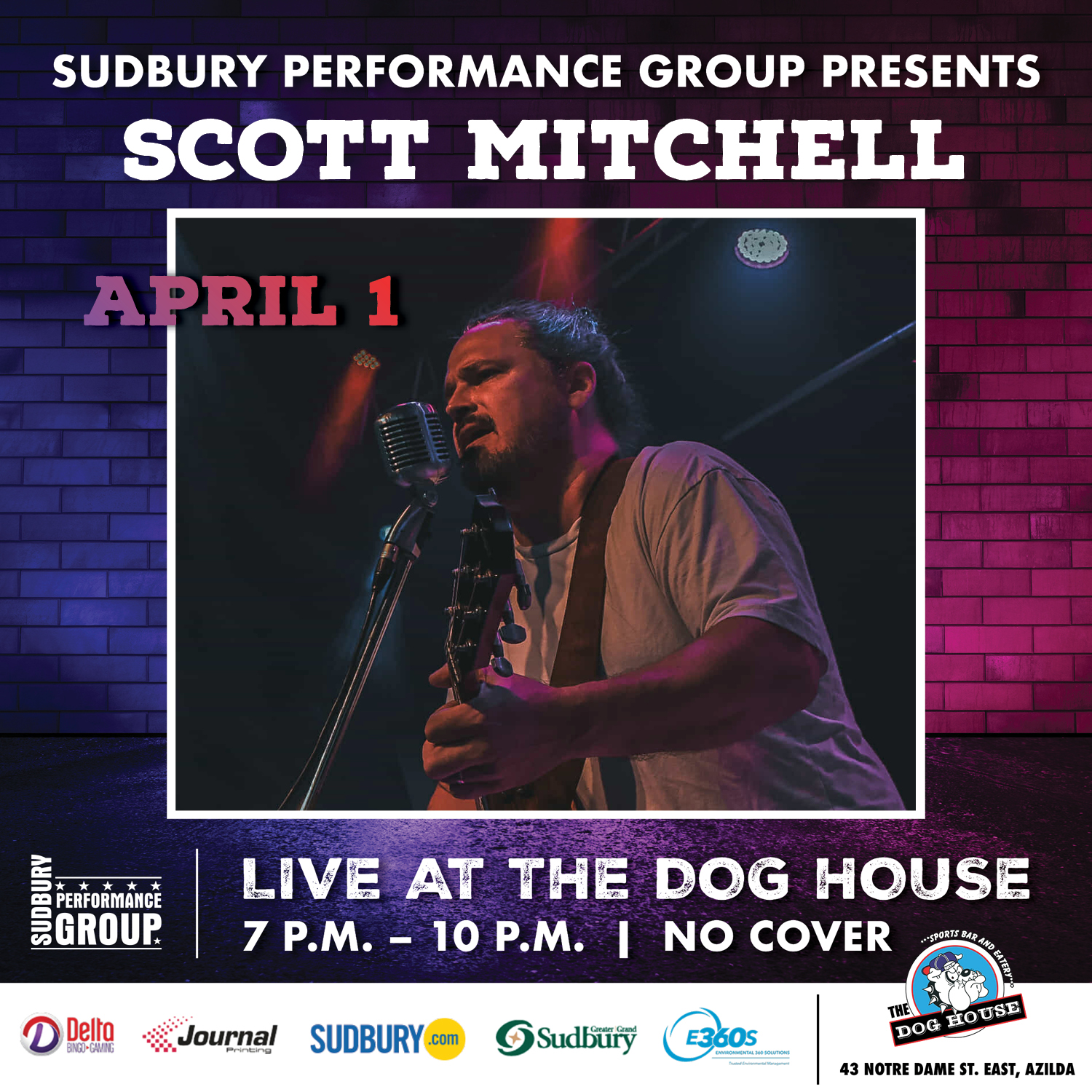 Home Events - Sudbury Performance Group Music Scott Mitchell Location The Dog House (Azilda) 25 Aldege St., Azilda, ON, Canada, Ontario Category Music Date Apr 01 2026 Expired! Time 7:00 pm - 10:00 pm Scott Mitchell Share this event
